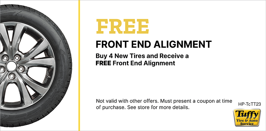 Good only atTuffy Pickerington Expires 07/15/26 Schedule Service Print coupon Share to Google Share to Facebook Offer details Buy 4 New Tires And Receive A FREE Front End Alignment * See coupon for exclusions. Email Coupon First name * Last name * Email address * Sign me up to receive future offers via text from Tuffy Pickerington: Via Text Cell/Mobile Phone By clicking "I accept" below, I expressly agree to receive marketing text messages made by or on behalf of Tuffy Pickerington to the telephone number(s) I’ve listed above. I understand that I may receive such text messages by the use of Automatic Telephone Dialing Systems (including “Predictive Dialers” or “Autodialers”) and I agree to receive them even if I have registered my number(s) with my state or federal Do-Not-Call list(s). I understand that such text messages will include advertising containing offers for goods or services and that I may revoke this consent at any time by telephone, return text message or by Visiting tuffypickerington.com/stop to unsubscribe. Message and data rates may apply. I also understand that I am NOT required to provide this consent as a condition of purchasing goods or services. I accept View: Text Specials Terms and Conditions with this link.